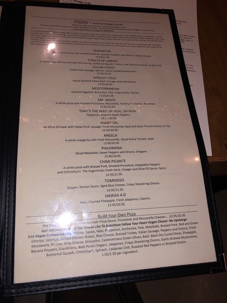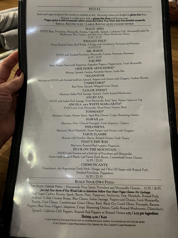 red sauce, "Follow your heart" vegan cheese, house made cashew ricotta, balsamic reduction, Grapes and crispy shoestring onions.