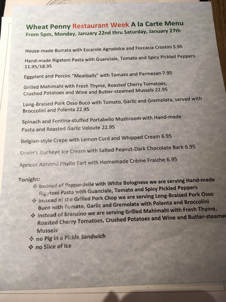 Wheat Penny Oven and Bar Menu